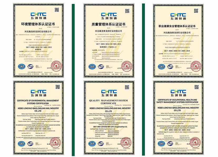 公司始終以“讓勞動創(chuàng)造更多價值”為企業(yè)理念,致力于生產(chǎn)優(yōu)質(zhì)高效的釘類產(chǎn)品。本次通過科學(xué)的管理體系和方法,不斷提升產(chǎn)品質(zhì)量與服務(wù)水平。此次公司通過了多項體系認證,標(biāo)志著青龍劍公司一直保持符合國際標(biāo)準(zhǔn)化的管理體系要求,進一步鞏固了青龍劍在行業(yè)中的領(lǐng)先地位。