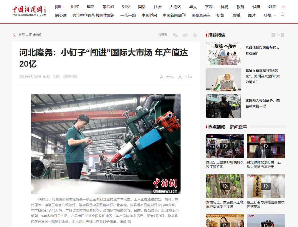 近日,中國新聞網(wǎng)記者走進(jìn)河北隆堯青龍劍釘業(yè)有限公司,對制釘車間的生產(chǎn)工序及車間環(huán)境進(jìn)行了解和拍攝。7月9日下午,青龍劍釘業(yè)榮登中國新聞網(wǎng)。青龍劍釘業(yè)將不斷探索、研發(fā)產(chǎn)品,通過技術(shù)升級、產(chǎn)品創(chuàng)新,為社會(huì)提供更高效、更安全緊固產(chǎn)品,提供更全面的基材連接緊固系統(tǒng)解決方案,樹立行業(yè)標(biāo)桿,助力國家建設(shè)![詳情] 2024-07-12 09:40:06