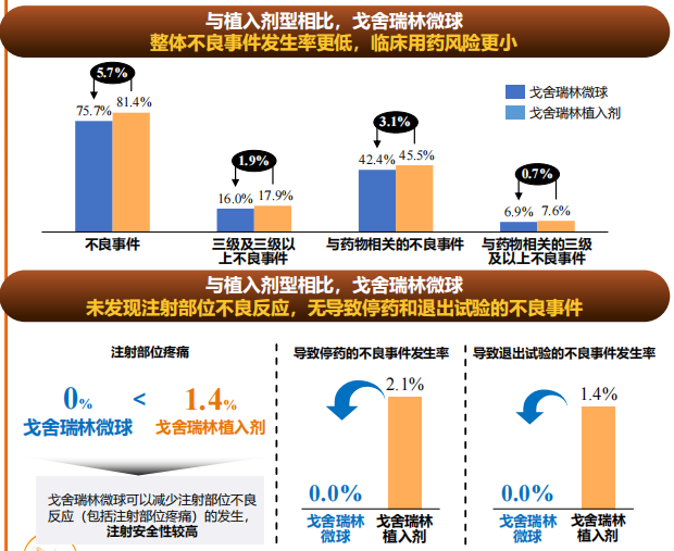 作為全球首個且唯一獲批的戈舍瑞林微球產品,百拓維從關鍵輔料到制劑均為我國自主研發,且采用了二代乳化溶劑揮發法更新工藝,實現了高達90%以上的藥物包封率和批次間高穩定性,并改善藥物的釋放效果。該產品打破了20多年來進口戈舍瑞林植入劑的壟斷地位,而且沒有單純仿制早先上市、不夠先進的微球制劑,而是選擇走劑型改良的開發策略。目前注射用戈舍瑞林微球用于前列腺癌的臨床III期研究論文已公布,從研究結果來看,注射用戈舍瑞林微球的去勢成功率與戈舍瑞林植入劑相當:該研究采用非劣效性設計,治療29天時(起始治療后的第2次注射)兩組去勢患者比例分別為99.3%和100%,維持至第85天時(起始治療后第3次注射)的比例則分別為99.3%和97.8%,注射用戈舍瑞林微球療效達到非劣于戈舍瑞林植入劑的標準。在主要終點及其它次要終點表現相當的情況下,注射用戈舍瑞林微球組患者注射部位不良反應(如疼痛、紅腫等)發生率顯著低于戈舍瑞林植入劑組(0 vs. 1.4%),證實了其改善患者治療體驗的價值,畢竟傳統植入劑注射針頭有1.6毫米粗,而注射用戈舍瑞林微球針頭外徑僅為0.8毫米,改善顯而易見;此外,研究中也未發現與注射用戈舍瑞林微球治療相關、并導致停藥和退出研究的不良事件[7]。復旦大學附屬腫瘤醫院副院長、泌尿腫瘤 MDT 首席專家葉定偉教授指出,注射用戈舍瑞林微球在臨床療效和安全性與植入劑型一致,注射方式、患者體驗更佳,為前列腺癌臨床治療提供了更多選擇。