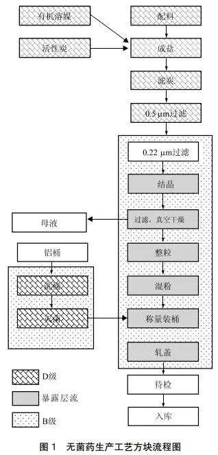 無菌原料藥生產(chǎn)中通常從后一步溶解脫色反應(yīng)開始,然后純化精制、結(jié)晶過濾、干燥、混合(可選項)、稱量包裝、貼簽入庫。通常生產(chǎn)工藝方塊流程如圖1所示。